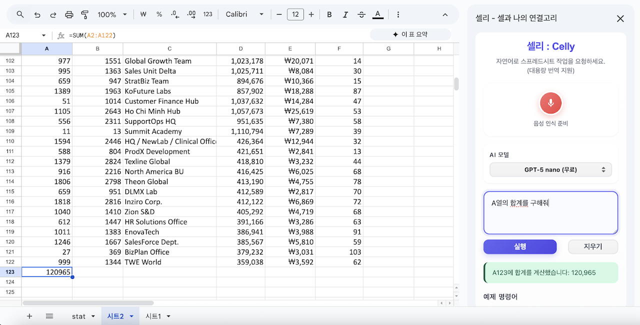• 자연어 명령 처리: “A열 합계 구해줘”, “3행 평균” 같은 자연어로 작업 수행