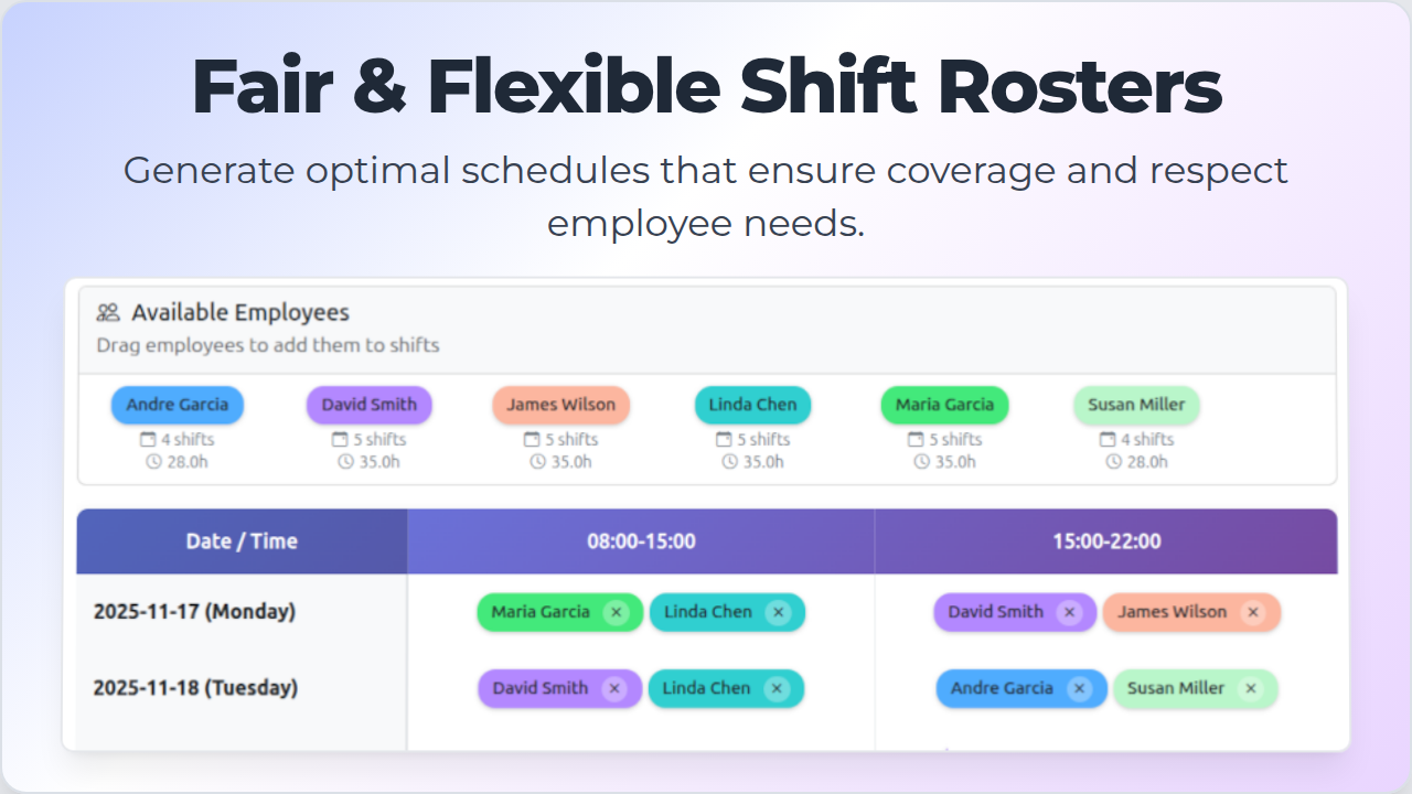 AI-powered scheduling that turns plain text into perfect shift and class schedules in minutes.