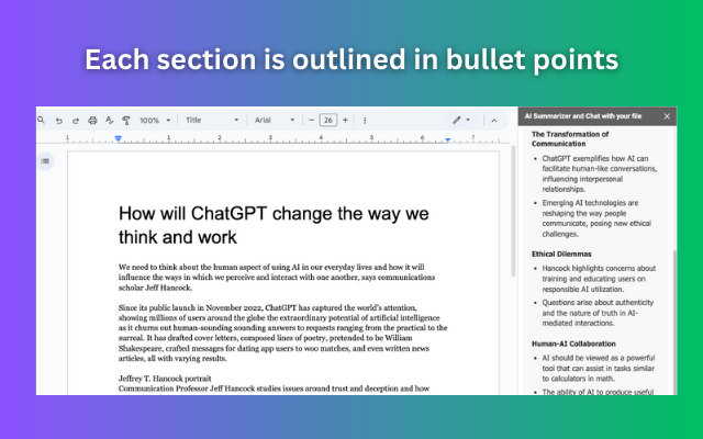 Our AI tool transforms how you work with documents. Easily summarize or chat with full files or selected text directly within Google Workspace. Ask questions or explore key topics, and get instant, precise answers from your content. Generate detailed summaries with descriptions, keywords, and organized lists. Simplify how you extract information and interact with your files. Features: ✅ Seamless integration: Works with Google Docs, Sheets, and Slides. ✅ AI-powered chat: Get context-aware answers to your questions. ✅ Efficient summaries: Quickly capture the essence with detailed outputs. ✅ Data privacy: Your content is handled securely. No data will be saved. How to use: - Open a file in Google Docs, Sheets, or Slides. - Select text or work with the entire file to generate a summary. - Use the chat interface to ask questions and get real-time answers. - Save and share insights effortlessly within your workflow. Experience smarter document management today!