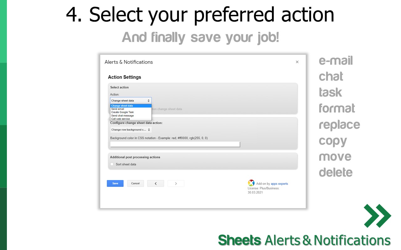 5. Finally select your preferred action and configure the action appropriately. By default Action “Change sheet data” is selected with option “test run”. Keep it to run a test run or change it directly to your preferred action and create automatic notifications via E-mail, Chat or create Google Tasks™.