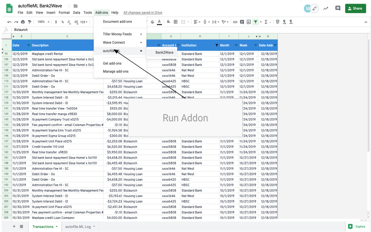 autofile.ML is a Google Sheet Addon which connects your Banks to Wave Accounting via Tiller Money. Note a subscription to Tiller Money is needed.