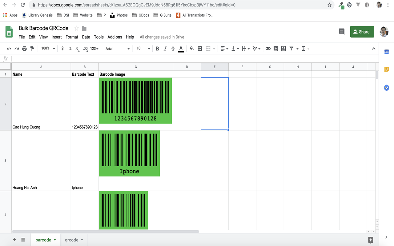 Bulk QR Code Generator makes barcode, QR Code creation really easy and quick, you create and insert all of them with a single click. Features: + Bulk QR Codes Generator generates ten thousands QR Codes and Barcodes and more with very high performance + Support more than 100 barcodes type including Point Of Sale, Two-dimensional symbols, One-dimensional symbols, Supply Chain, GS1 DataBar, Postal Symbols, Pharmaceutical Symbols, Less-used Symbols, GS1 Composite Symbols, Raw Symbols, Partial Symbols, for example GS1 Data Matrix + Customize barcode attributes such as format, value, color, label, label font,... + Bulk QRCode Generator can customize QRCode attributes such as content, fill color, background color, label, label position, label font, image, ... + If your QRCode contains a website URL, you can track how many users click using Bitly or Google Analytics™ (please view https://www.youtube.com/watch?v=HZ0w1_Xsj6I&t=1s for how to track) + Bulk Barcodes Generator generates barcodes and QR Code images into Sheet™ and print them online + You can change the QRCodes position (top, middle, and bottom) in the pdf file + Bulk Barcode generator supports two lines, multiple lines barcode. For example, you want to print two lines, insert \n between two lines, for instance example\n123 + Insert branded logo, image into QR Code + Preview and download them as PDF format. You can add description below QR in the PDF file + Create dynamic QR using bit.ly in your link + If QR Code label is too long, please choose Mode "1-Label-Strip" and Error Correction Level "High" + Bulk Barcodes generator supports multiple languages + Support save setting so you can generate bulk QRCodes and barcode quickly + If you want to download QR Code and barcode images, and want send them to customers via email, please use this mail merge add on https://gsuite.google.com/marketplace/app/mail_merge_bulk_barcode_qr_code_generato/234818586746 . This mail merge tool requires permission to access your Google Drive™ and some other scopes for sending emails + Bulk Barcode generator supports all paper size including A3, A4, A5, etc + During the trial period, you can generate codes with a limited number of scans (set randomly for each trial). This allows you to experience the features and benefits of our add-on at no cost. + To enjoy unlimited scans and unlock the full potential of the add-on, we invite you to upgrade to the premium version. Troubleshooting: + If you don't see the popup window when generating or printing QR, please check your browser. It seems that browser is blocking the popup window. We highly recommend to use the Chrome. + If you see this warning "ScriptError: Authorization is required to perform that action", please follow this link https://www.2hac.com/faq/authorization-is-required-to-perform-that-action/ to fix this issue + If you only see help menu after installing, please follow this link https://www.2hac.com/help/how-to-fix-only-help-menu-issue/ to uninstall and reinstall the addon For scanning QR and barcode, we highly recommend using the Iphone Camera app if you have been using Iphone or Ipad. For Android phone, we recommend using the Google Lens™ app https://play.google.com/store/apps/details?id=com.google.ar.lens&hl=en Resources and Tutorials ------------------------------------ ➩ YouTube video tutorial: https://www.youtube.com/watch?v=HZ0w1_Xsj6I&list=PLk31adfFOxDHPDpMlg33sjOSdtfi4AaFH ➩ Help: https://www.2hac.com/help/index.html ➩ Email Support: 2hacstudio@gmail.com