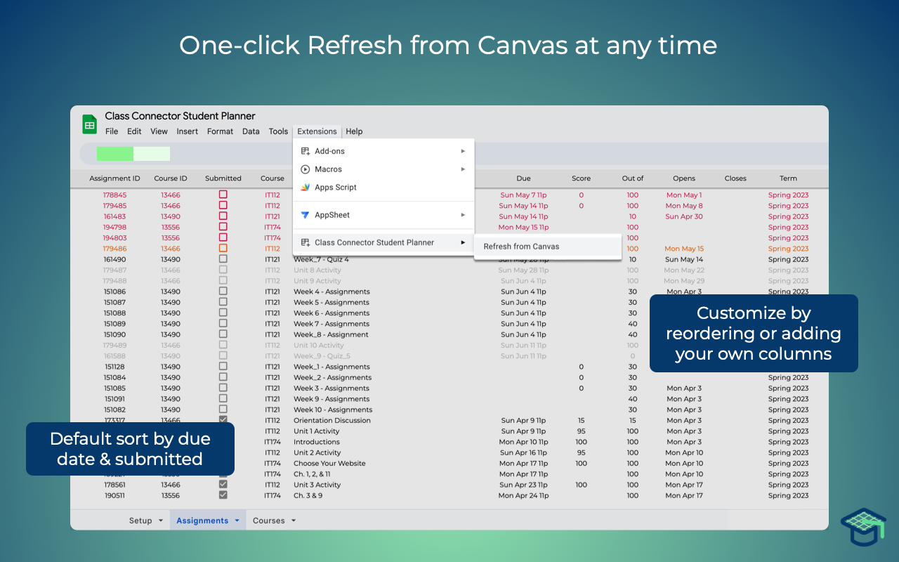 Easy to setup. Pulls all your data from Canvas ongoing. Easy to refresh throughout your academic year. New information ( such as scores from your instructors ) are highlighted green. Every assignment links to the full assignment in your Canvas. Sort, filter, add columns, add custom rows.