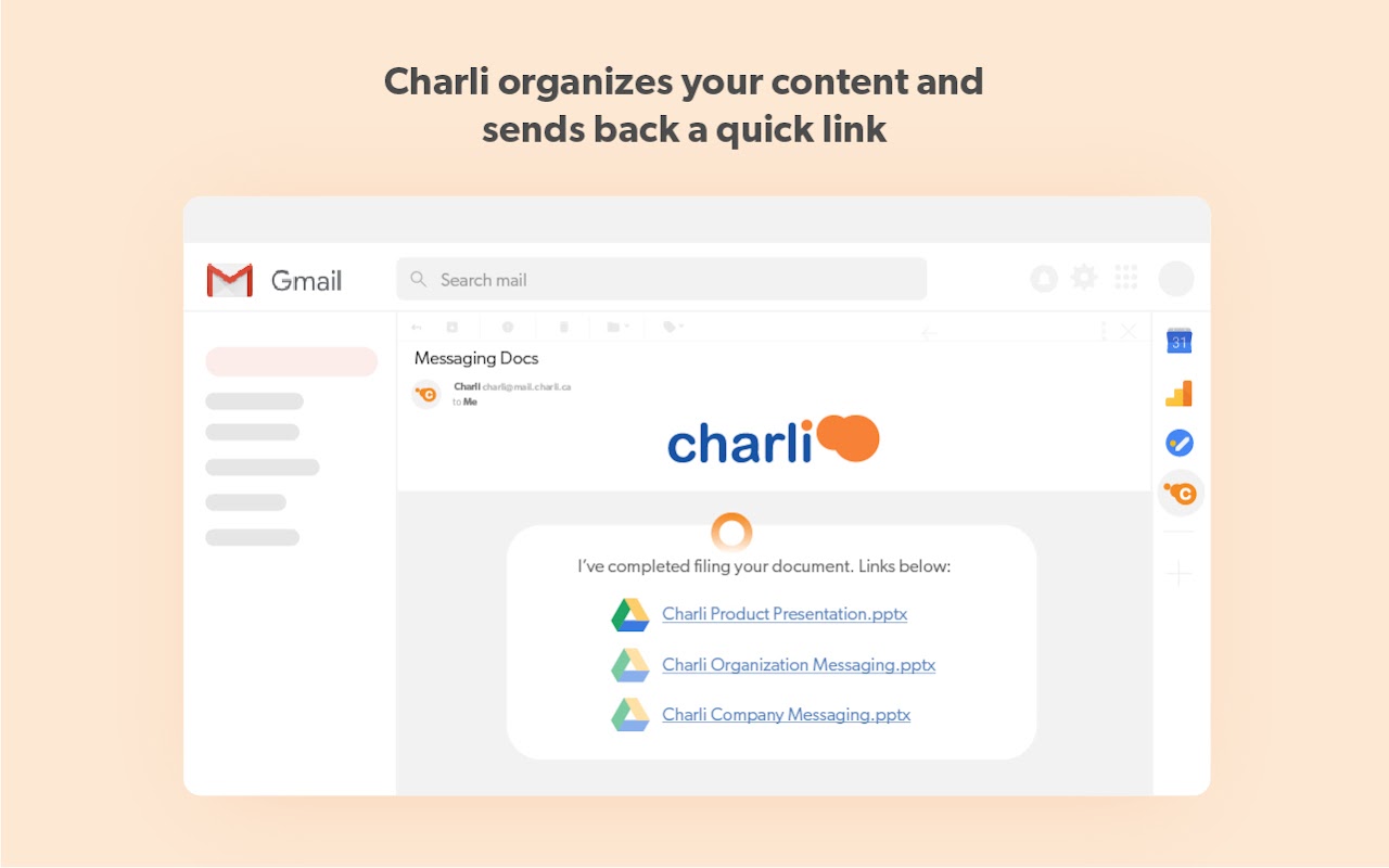 Charli is the easiest way to get your content organized. Send attachments, emails, or other important stuff for Charli to organize directly to your Google Drive - all without leaving your inbox.