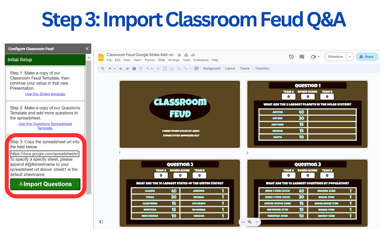 Instant Import: With just a click, import your questions and answers from Google Sheets™ into Google Slides™, saving you time and ensuring you're game-ready in an instant.