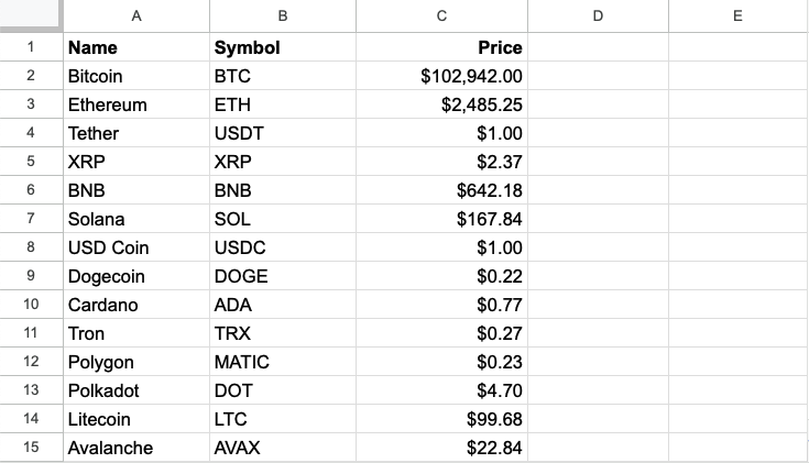 Real-time crypto data in Google Sheets™ — prices, 24h/7d change, market cap, volume, rank, supply and all-time highs for 10,000+ coins