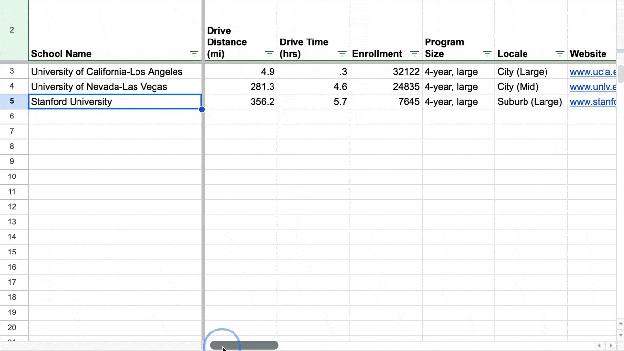 Once you choose a school, College Compare adds it as a new row in the spreadsheet. You can repeat this process to add more schools to your comparison.