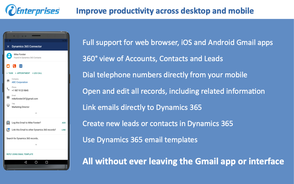 Integrate your Gmail™ and Microsoft Dynamics CRM in one easy step with virtually nothing to install. The connector works in any modern browser including Chrome, Edge and Safari.  It also works on mobile devices such as Android and iOS Devices.  The add-on can be deployed to your entire company with a single click.  Contact sales@ienterprises.com for details on enterprise licensing and deployment.