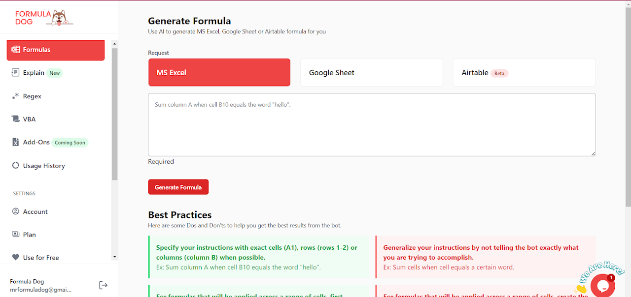 Formula.dog is a powerful and user-friendly Google Sheets™ add-on designed to revolutionize the way product creators, marketers, and analysts work with Excel formulas. With its advanced AI model, Formula.dog provides instant access to a wide range of formulas, saving you valuable time and effort that would otherwise be spent searching online. Whether you're working on complex calculations, analyzing data, or simply need to perform routine tasks, Formula.dog has you covered. Its intuitive interface lets you convert your english language text into formulas you need, without having to remember complex syntax or waste time searching for the right formula online. With Formula.dog, you can streamline your workflow and focus on what really matters: getting the job done. Whether you're a seasoned Excel user or just starting out, this add-on is the perfect tool for anyone who wants to work smarter, not harder. So why wait? Get started with Formula.dog today and experience the power of efficient data analysis.