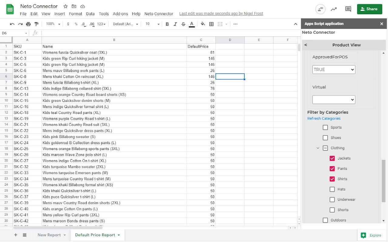 This connector will be undergoing continual improvement with the goal of providing a quick and easy way to extract data, edit it and save it back to Neto. Using CSV export and import data can be time-consuming and error prone. This tool will help streamline the process by providing common views for reporting on and editing data directly from Google Sheets. Whether it be updating product data assigning product to categories or reporting on order quantities, this tool help may it super easy.