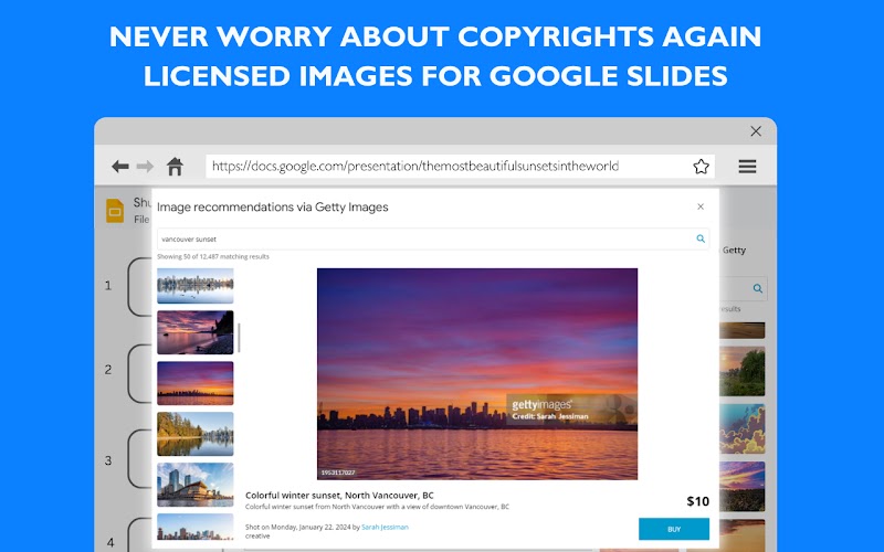 Seamlessly access millions of high-quality Getty Images directly within Google Slides™. Elevate your presentations with professional, licensed visuals.
