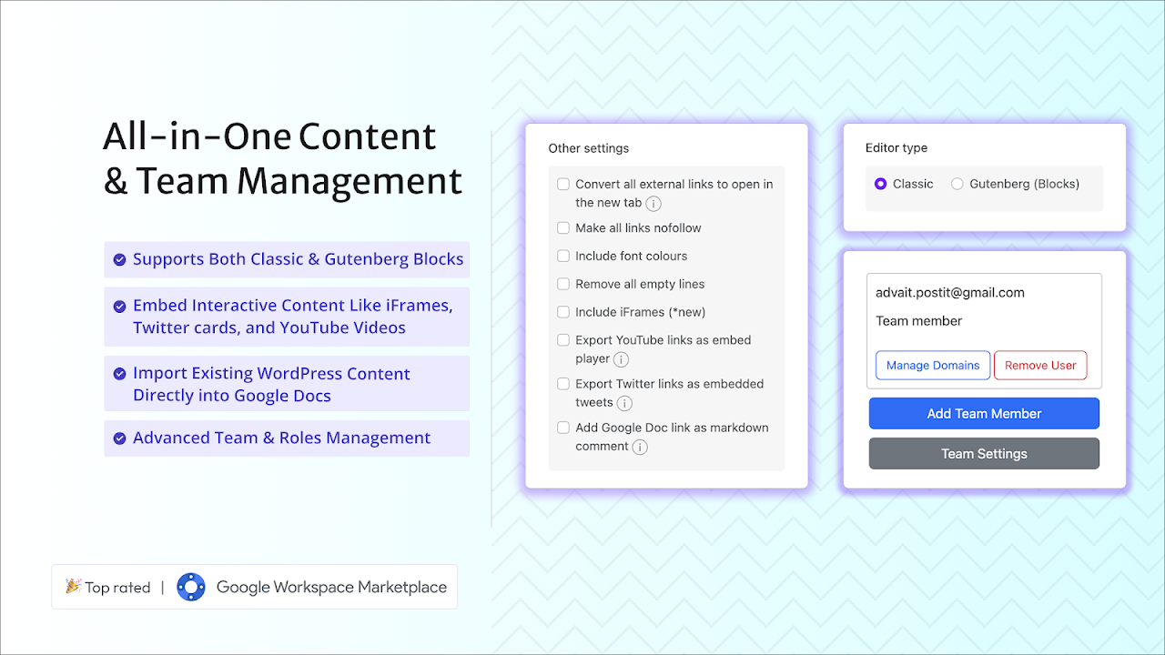 ✅ No plugin needed: Works directly from Google Docs™. No WordPress™ plugin or extra setup.