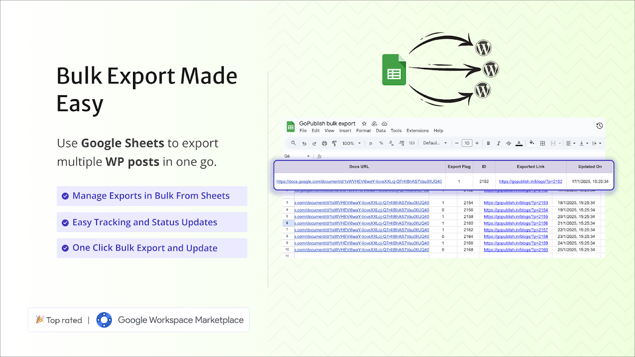 ✅ Bulk publishing: Use Google Sheets to publish multiple Google Docs™ to WordPress™ posts at once.