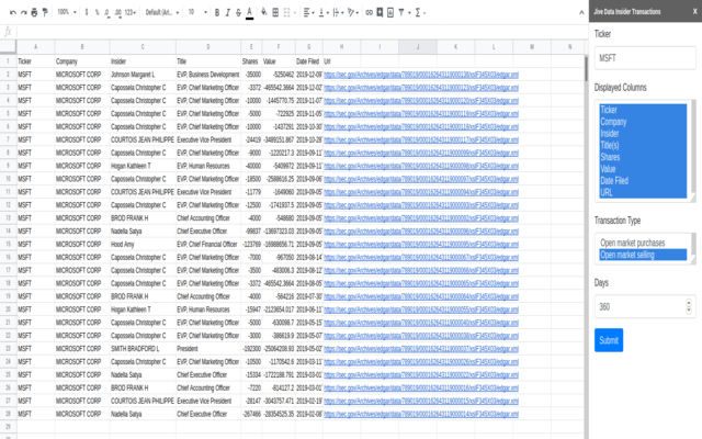 Insider Transactions from Jive Data gives you the power to track SEC form 4 filings directly in Google Sheets with no coding required. Powerful and timely analysis lets you follow the buying and selling by CEO, CFO, Directors and other insiders.