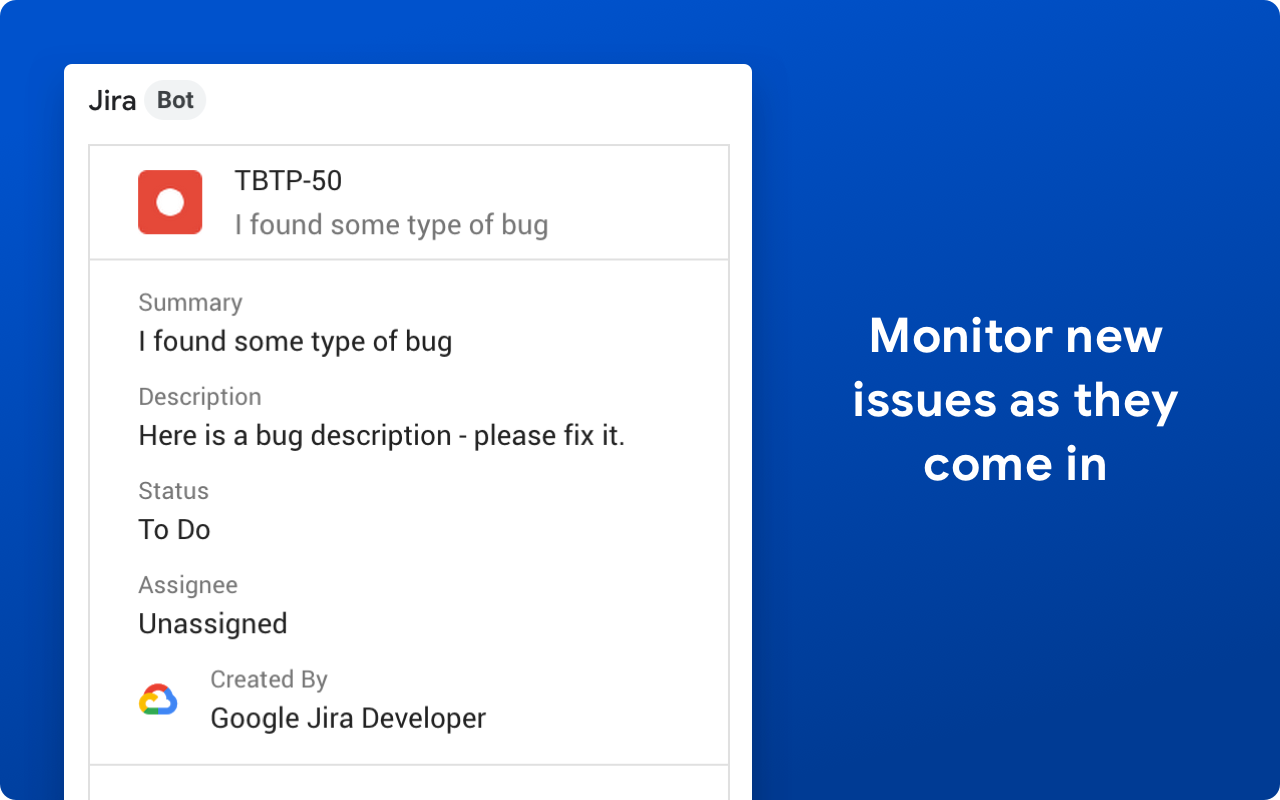 Jira is a great way to manage your issues and bugs. With Jira for Google Chat, you can receive notifications, easily create issues, assign them to the right people, and track your progress while keeping everyone in the loop. Note that this app only works with Jira Cloud.