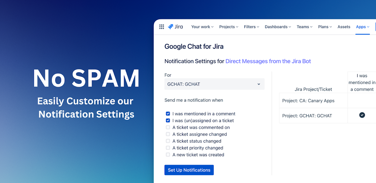 The Jira Watcher chat bot allows you to receive notifications for Jira project and ticket updates right within Google Chat™