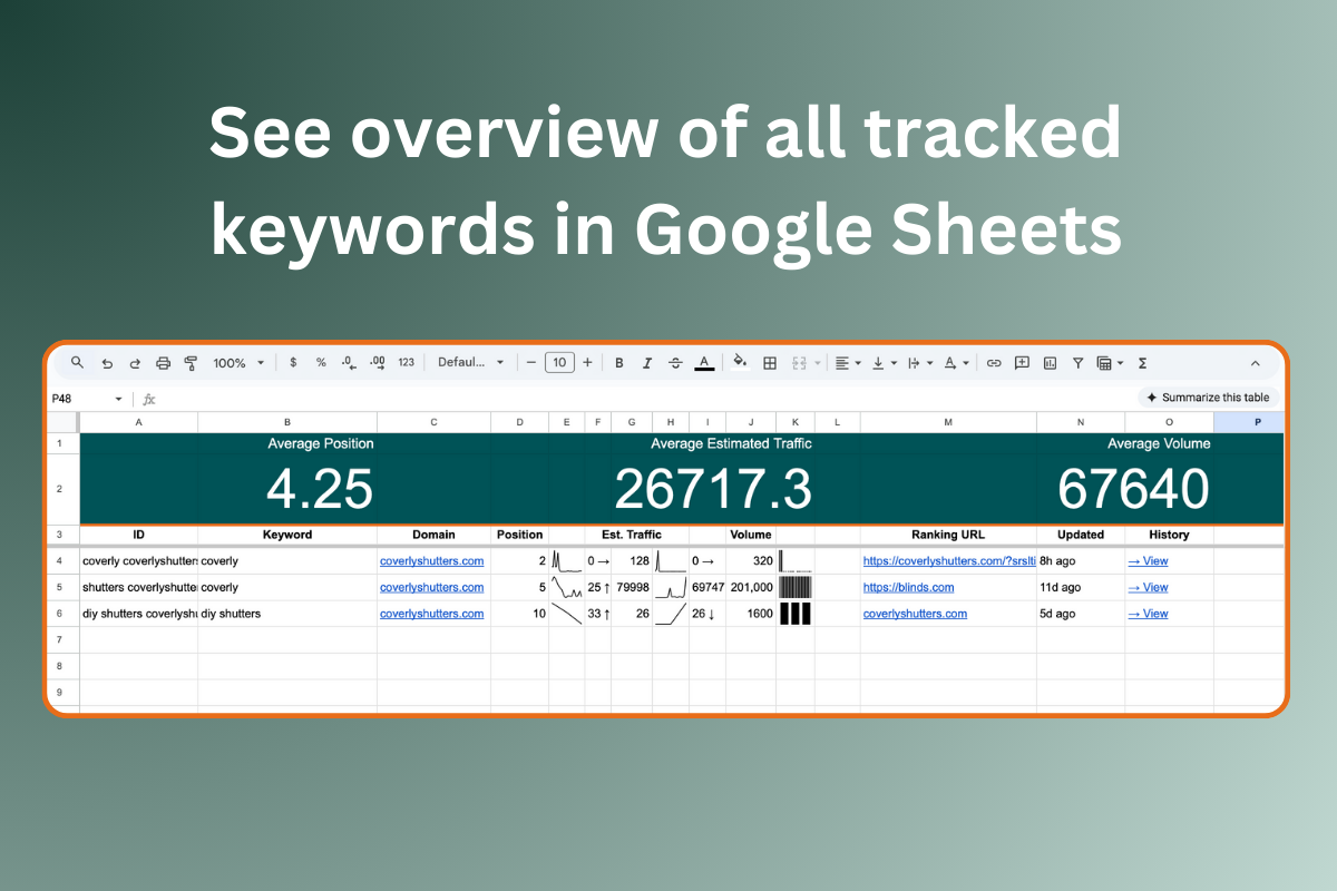 Keyword Rank Tracker is a lightweight yet powerful Google Sheets™ SEO tool built for marketers, SEOs, and business owners who want to track keyword performance without the complexity of traditional dashboards. This app transforms your spreadsheet into a fully functional rank tracker, giving you real-time insights into your keyword positions, search volume, estimated traffic, and domain rank—all directly inside Google Sheets™. Whether you’re managing a single site or tracking hundreds of keywords across multiple domains, Keyword Rank Tracker offers the flexibility you need: • Bulk keyword checks – run large batches of keywords in seconds • Scheduled reports – automatically track and log ranking history over time • Email reports – send ranking updates straight to your inbox • Historical comparisons – monitor changes and trends week over week • Multi-domain support – manage SEO across clients or properties From live data pulls to automated reporting, Keyword Rank Tracker helps you stay ahead of your competitors, optimize for growth, and keep clients or stakeholders informed—without ever leaving your spreadsheet.