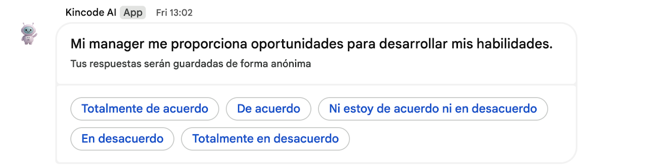 Kincode AI is your Culture Copilot—right where your people work. Integrated directly into Google Chat™, Kincode AI helps People & Culture teams build high-performing, aligned organizations through micro-interactions, real-time feedback, and actionable insights. Whether you’re scaling culture across a distributed team, boosting engagement, or monitoring sentiment, Kincode AI makes it easy—right inside Google Chat™. What Kincode AI lets you do: • 📩 Answer pulse surveys directly in Google Chat™ Employees receive short, simple surveys via Chat—measuring sentiment, alignment with values, leadership satisfaction, and more. • 📊 Track engagement and culture trends in real-time HR and managers gain visibility into participation, scores, and trends—by team, manager, or location. • 🤖 Ask KAI (the Kincode AI assistant) Chat with KAI to ask for team insights, drivers of disengagement, or recommended actions. • 📣 Nudge managers to take action The system gently prompts team leaders when something needs attention. Upcoming features: • 🫶 Recognize teammates (Coming soon) Send kudos and highlight value-based behaviors. • 💬 Submit HR requests (Coming soon) Employees can open tickets or questions directly through Chat. • 🎉 Celebrate birthdays & milestones (Coming soon) Automated messages for birthdays and work anniversaries in shared spaces. Requirements • A valid Kincode AI account (workspace setup required) • Google Workspace™ domain with Chat enabled Who it’s for • People & Culture teams • HR Business Partners • Team managers • Employees who want a voice and visibility