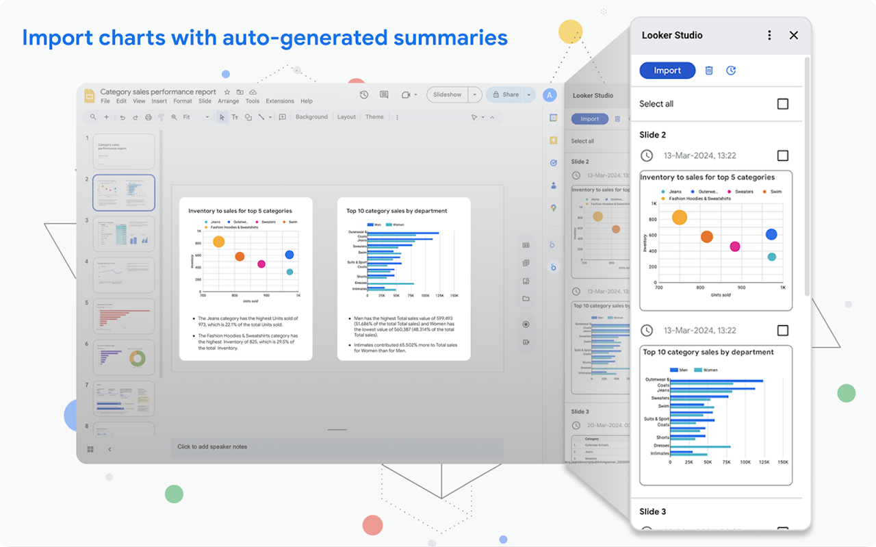 - Click the “Import” button, which opens the Looker Studio page from where you can select and insert the Looker Studio visualizations into the slide presentation. Alternatively, use Generate Slides from the Gemini panel in Looker Studio to create your presentation