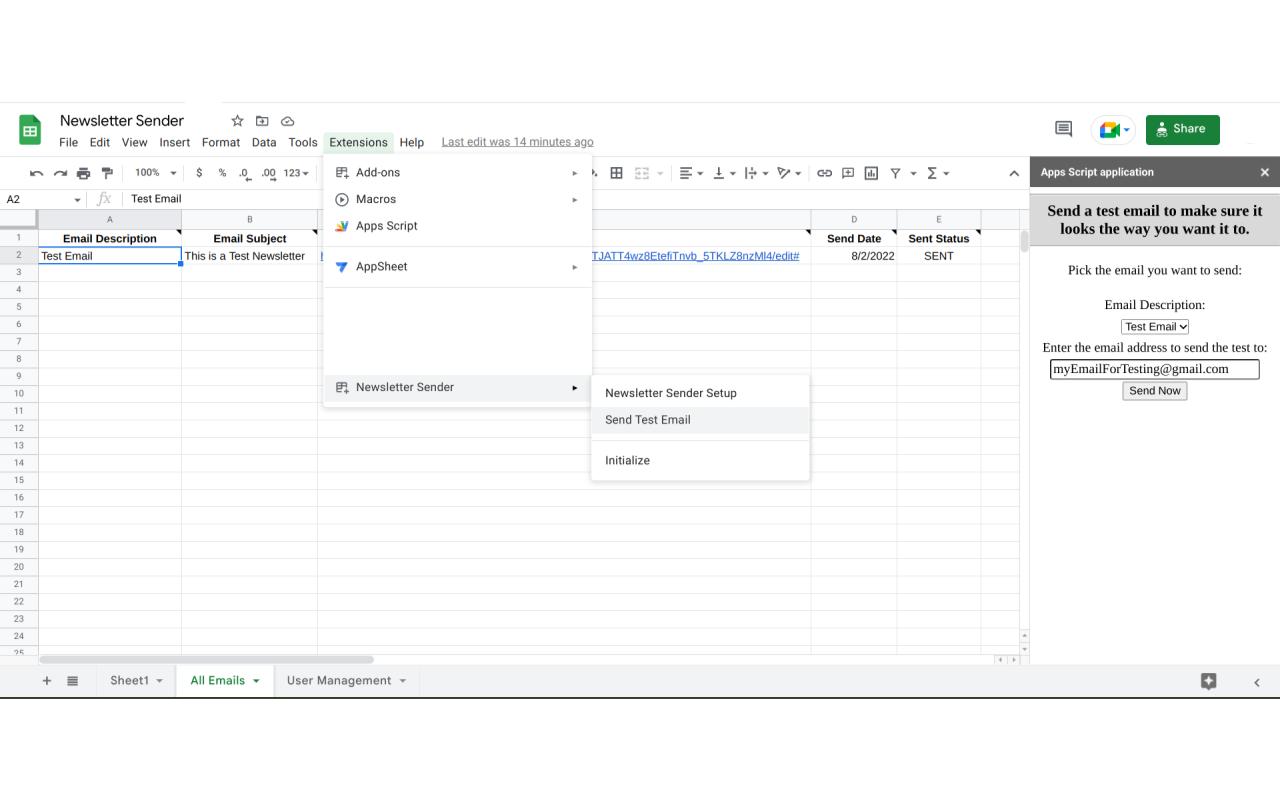 With this add-on, you can design professional-looking emails using Google Docs™ and schedule that email to be sent to your email list.  Create and manage your list of email newsletter subscribers then schedule the date to send the newsletter out. Newsletter Sender automatically sends the email to everyone on your email list.