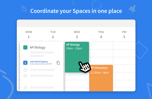 It has never been easier to collaborate online with Pencil Spaces! Automatically set-up a Space from Google Calendar™ and invite others in just 1-click. Install this add-on and start using Pencil Spaces with Google Calendar™ in 60 seconds or less. --- About Pencil Spaces --- Pencil Spaces makes it easier for you to learn, teach, and collaborate online. With Spaces you can: - Invite students, colleagues, and friends into your Space and hop-on a video call. Spaces are saved forever, so you can return to the same Space at any time - Use our whiteboard to collaboratively share ideas - Import content, such as PDFs, images, or videos directly into your Space You can get started with Pencil Spaces for free at https://pencilspaces.com