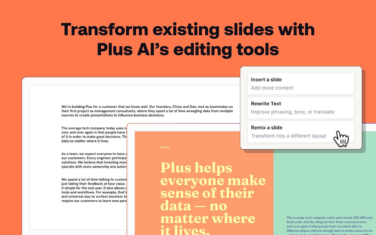 With Plus AI, you can use the same AI technology that powers tools like ChatGPT, Duet AI, and Copilot to make beautiful presentations and well-written documents for work and school. Plus AI for Google Slides™ is the best AI presentation maker to create and edit presentations, directly in Google Slides™. And Plus AI for Google Docs™ is the best AI writing tool to write and edit content, directly in Google Docs™. Stop wasting time creating slides and writing blog posts from scratch, and let our AI tools do the boring work for you! 👉 How to get started with Plus AI for free • Install Plus AI from the Google Workspace Marketplace by clicking “Install.” • Open any Google Slides™ presentation or Google Docs document. • Click Extensions -> Plus AI for Google Slides™ -> New presentation with Plus AI. • Enter a prompt or drop in your text to create a new presentation. 👉 Plus AI features • Use Edit with Plus AI to insert new slides, rewrite existing slides, or remix slide layouts. (Use AI to convert a plain text slide into a well-formatted three column slide) • Design custom themes with our presentation AI. (Type in the name of your theme, and let our Google Slides™ AI automatically select beautiful fonts and colors for your deck) • Co-create and co-write with an AI for presentations. (Our Google Slides™ AI provides tips and tricks on how to improve your presentation on each slide) • Ensure your team’s presentations have consistent designs, styles, and tones. (Create shared themes and custom AI instructions) • Translate your slides and generate slides in any language. (Use our Rewrite tool and ask Plus AI to "Translate this slide from English to Spanish") • Format your slides and apply consistent formatting. (Use our Remix tool to change a simple slide into a three column slide, a pro/con slide, or more) • Write blog posts or marketing copy just by providing a short prompt (Use generate mode in Google Docs™ to have AI write new content for you) • Edit existing text with AI using our editing tools (Use edit mode in Google Docs™ to rewrite and reformat an existing document) • Use Plus Snapshots to pull data from all of your analytics tools and apps. (Take Snapshots using our browser extension and automatically refresh the data on your slides) 👉 Start for free • Start generating and editing presentations with our AI presentation maker for free. • Upgrade for unlimited AI usage, premium layouts, custom themes, and more. 👉 Popular use cases and personas • Sales presentations - Need to create dozens of presentations for customers and prospects? Use AI to automatically generate customized slide decks for each of your meetings. • Educational materials - Create online courses, training materials, and other educational content using the Plus AI presentation maker to save time and focus on teaching, not slides. • Business assistant - Treat Plus AI as your personal business analyst who can do basic research, transform content from blog posts into slide decks, and create well-formatted slides. • Marketing collateral - Ask AI to create ad copy, write blog posts, and come up with marketing strategies for you. 👉 Presentation templates, right in Google Slides™ • Use Plus AI to design the perfect presentation templates for your organization. • There’s no need to use separate template galleries like SlidesGo and SlidesCarnival or learn new apps like Canva, Beautiful.ai, Tome, Gemini, or Copilot. • Plus offers an extensive set of slide layouts compared to other add-ons like SlidesAI, MagicSlides, and GPT Workspace. • After creating new presentation themes, share your designs, supporting content, visual styles, and writing styles with your team. 👉 How Plus AI works • Open the Plus AI add-on and write a short description of the presentation you want. • You can talk to Plus AI just like ChatGPT, Bard, Claude, or your favorite chatbot • Plus AI generates a presentation outline. Review and adjust the outline as needed. • Plus AI writes your slides. Review, make final edits, and you’re ready to present! 👉 Plus Snapshots • Capture Snapshots of any website, app, or dashboard with Plus. Embed Snapshots in your Google Docs™ and Google Slides™. Refreshing all of your Snapshots with one click. • Plus works with all your favorite collaboration tools. Embed live Snapshots in tools like Notion, Tome, Confluence, Canva, and more. Set up automated Slack subscriptions to keep your team up-to-date. • Go back in time and view every historical version of your Snapshots. Search the content of your screenshots using OCR, and set up automatic notifications when something changes. 👉 About Plus At Plus, we are building AI productivity tools to help people make their day-to-day work easier. We focus on the parts of work where AI can do the best job: brainstorming, creating outlines, first drafts, and editing and revising. 👉 Try out all of the Plus AI products • Plus AI for Google Slides™ • Plus AI for Google Docs™ • Plus Snapshots