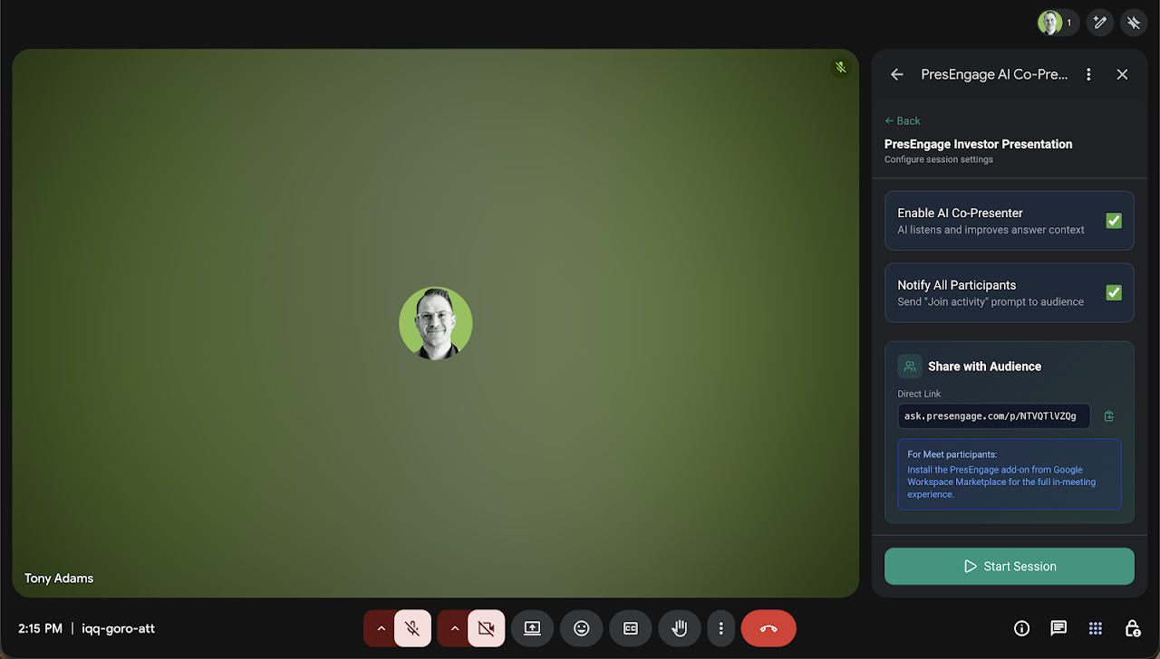 PresEngage™ adds an AI Co-Presenter to your Google Meet™ sessions that answers audience questions in real time using your presentation slides as context.