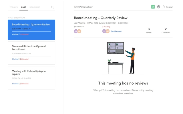 RateTheMeeting is your very own feedback collector for your google calendar meetings with clients and colleagues. With RateTheMeeting you can ask your meeting attendees to provide feedback on parameters of your choice and evaluate your score with our exciting and insightful dashboard.