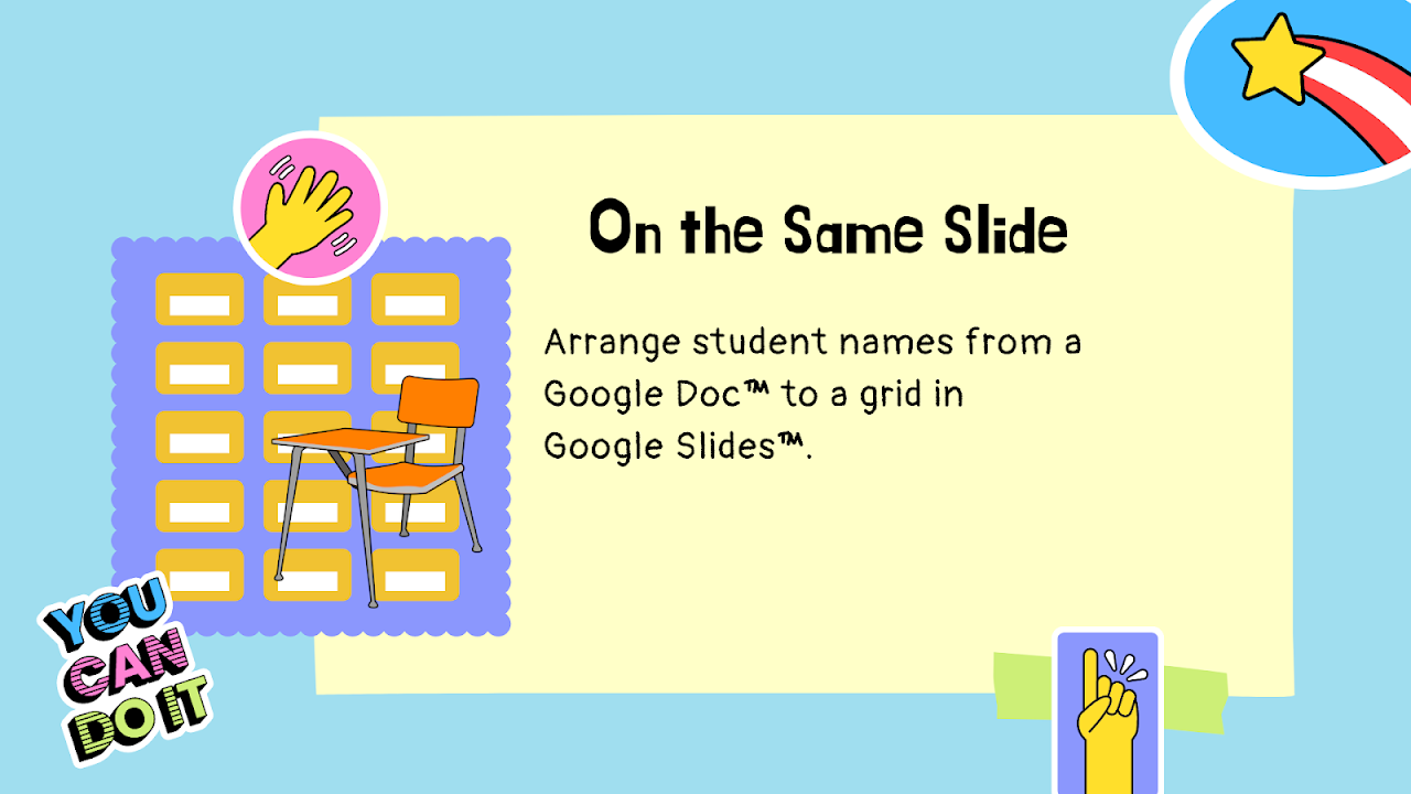 Create seating charts or word sorts! Put a list of student names (or vocabulary words) in a Google Doc™ and use the Seating Chart Slides Add-on to create a Google Slides™ with a tile for each student (vocab word). Drag and move the tiles to create a seating chart or word sort.