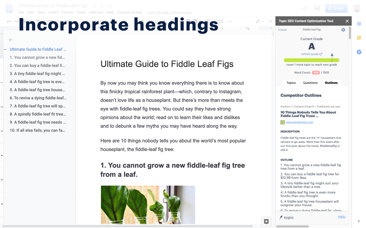 Choose the best headings and subheadings for your article based on outlines of top-ranking content. Easily see how others have broken down a complex subject into more manageable pieces.
