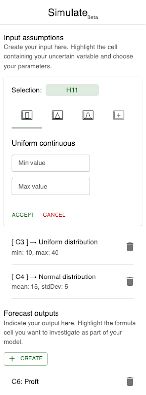 Simulate is a powerful and easy-to-use tool designed to enable Monte Carlo simulation right in your spreadsheet. With Simulate, you can support your decision-making processes by carrying out the following steps: 1. Define input assumptions: Select key variables such as revenue estimates, market growth rates, or project costs influencing your model's outcomes (non-formula cells). 2. Set input ranges: Define the range of possible values for each input variable, allowing for comprehensive scenario exploration and what-if analysis (currently triangular, normal or uniform distributions). 3. Select key outputs: Choose outputs you want to analyze, whether it's revenue projections, risk metrics, or other performance indicators (formula cells). 4. Run simulations: With just a click, Simulate leverages Monte Carlo simulation to sample and generate a range of possible outcomes based on your defined inputs and assumptions, providing you with valuable insights into uncertainties and risks associated with your decision. You can create up to a thousand scenarios with each run and easily export your data for further analysis in any other software. In this way, Simulate acts as your brainstorming partner aiding in the analysis of various scenarios and uncertainties. With Simulate you can: ✓ Harness uncertainty: Understand the full range of potential outcomes, and assess the likelihood of different scenarios to make better-informed decisions. ✓ Identify risks: Identify potential risks and assess their impact on your objectives by simulating various scenarios, letting you develop risk mitigation strategies proactively. ✓ Analyze sensitivities: Simulate generates the necessary data for conducting more in-depth sensitivity analysis, helping you identify the sensitivities within your models. ✓ Conduct what-if analysis: Explore different what-if scenarios effortlessly and assess the potential consequences of your different actions. You can easily create figures and histograms using the output data or even export it for further analysis in other software. ✓ Improve decision-making: Gain deeper insights into your data, enhance your judgment, and make more informed decisions that align with your goals and objectives. Simulate eliminates the need to program your own Monte Carlo simulation logic and handles most of the underlying complexity involved, allowing you to focus on generating scenarios, analyzing the results and deriving actionable insights. Whether you're a financial analyst, project manager, or business strategist, Simulate empowers you to see the full range of outcomes helping you improve your judgment and make better decisions with confidence. Please note: This is a fully functional public Beta release designed to support your basic modeling tasks and to gather public feedback for improving the tool. Features and limitations may change at any time in future updates. To make the tool more robust, improved visual outputs, correlations, sensitivity analysis, real options methods, decomposition functionality and more are being considered to be implemented in the future.
