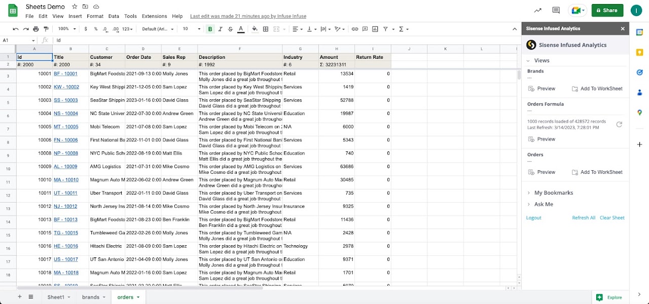 Infuse analytics directly into your Google Spreadsheets and Slides with Sisense Analytics. Whether you are a spreadsheet wizard or a presentation maven, Sisense Analytics helps you pull and use data into the Google tools you already know and love. From within Google Sheets or Slides, Sisense Analytics allows you to: - Ask natural language questions to Views in Sisense to get results and insights - Bookmark your favorite queries for easy access and reuse - Create Google native visuals that can be updated to reflect new data with 1-click - Summarize results and trends by adding consumable narratives that highlight changes in your data When used in Google Sheets, Sisense Analytics allows you to pull the data you want yourself--no waiting for someone else to provide an export. You can perform analyses on the most recent data or combine with data from other applications to discover more connections. When used in Google Slides, Sisense Analytics allows you to quickly share data in the graph and chart formats of your choice. People responsible for regular presentations like weekly ops reports or quarterly business reviews (QBRs) can make reusable slide decks. To create a new report from an existing report, duplicate the old report and rename it, refresh the data, and familiarize yourself with the results. Complete a new report with fresh charts and data in minutes instead of hours without leaving Google Slides. To learn about Infusion Apps for other applications - Slack, Microsoft Office 365 and Microsoft Teams - check out. https://www.sisense.com/platform/infusion-apps