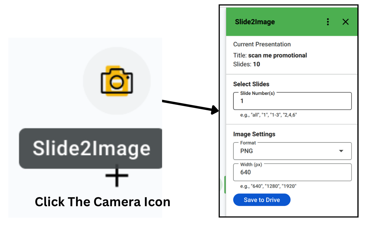 **👋 How to Launch Slide2Image (Important!):** After installing, open any Google Slides™ presentation. Look for the **arrow in the bottom right corner** of your screen. Click it to expand the side panel. Then, find the **“Camera Over Slide” icon** and click to open the add-on. -------------------------------------------------------------------------------------------------------------------- ** What's New! 🌟** **v2.2.0: Email Verification Code Related Bug Fixed** - Email Verification Codes sending process is now being normally processed. -------------------------------------------------------------------------------------------------------------------- # Slide2Image: Convert Slides to Images Instantly! 📸✨ **Effortlessly transform your Google Slides™ presentations into high-quality images with Slide2Image!** This handy add-on lets you: 🚀 **Flexible Export**: Convert **single, multiple (e.g., "1-3", "2,4,6"), or all** slides to images! 📏 **Custom Dimensions**: Define your preferred image **width** in pixels. 🖼️ **Choose Your Format**: Now supports PNG, JPEG, BMP, SVG (scalable vectors), and GIF (animated slides) for ultimate versatility. 💾 **Direct to Drive**: Images are saved straight to your Google Drive™ for easy access. ------------------------------------------------------------------------------------------------------------------- ## How to Use Slide2Image! ✨ 1️⃣ **Enter Slide Numbers**: Specify slides (e.g., "1", "1-3", "2,4,6", or "all"). 2️⃣ **Choose Format**: Select PNG, JPEG, BMP, SVG, or GIF. 3️⃣ **Set Width**: Enter a custom width in pixels (e.g., 800 for small, 1920 for wide). 4️⃣ **Save**: Click **Save**, and images are exported to your Google Drive! **Pro Tip**: Entered invalid slide numbers? The add-on will prompt you to correct them. ---------------------------------------------------------------------------------------------------------- ## Who’s It For? 🌟 - **Educators**: Create handouts or course visuals from slides. - **Marketers**: Turn slides into social media graphics or blog images. - **Presenters**: Export slides for reports or client deliverables. - **Designers:** Export SVG for scalable web graphics or BMP for high-fidelity editing. ---------------------------------------------------------------------------------------------------------- ## Common Questions ❓ - **Where are images saved?** In the same folder as your presentation in Google Drive. - **How fast is it?** Most exports finish in seconds, depending on slide count. - **Why choose each format?** - PNG: High quality, transparent backgrounds. - JPEG: Smaller file sizes for web or email. - BMP: Uncompressed, ideal for editing. - SVG: Scalable vectors for web or print. - GIF: Animated images for dynamic content. ----------------------------------------------------------------------------------------------------------------------- ➡️ Need a quick guide? Check out the detailed User Guide @ https://www.scriptportal.dev/products/slide2image#h.s7du6il1lxr