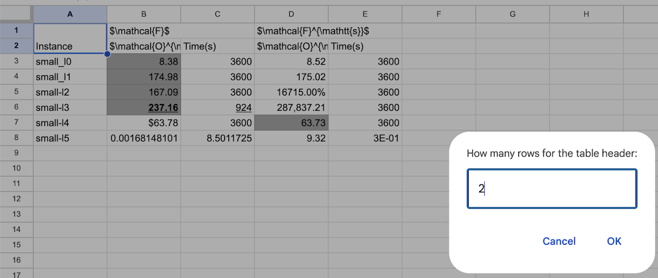 (1) copy the LaTeX code between \toprule and \bottomrule of a table and paste it to any place in a Google spreadsheet,