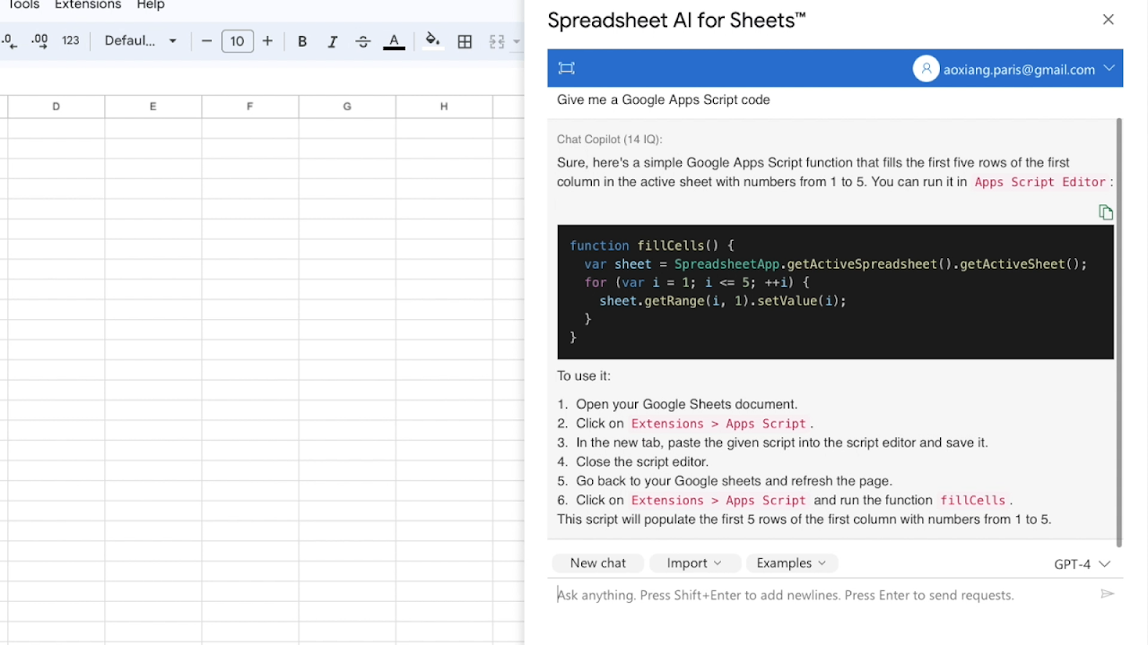 "Spreadsheet AI for Sheets™" aims to be an AI-assisted software solution suite for a wide range of spreadsheet tasks. Currently, it mainly offers a chat copilot integrated into Google Sheets™ that can discuss any questions you may have.