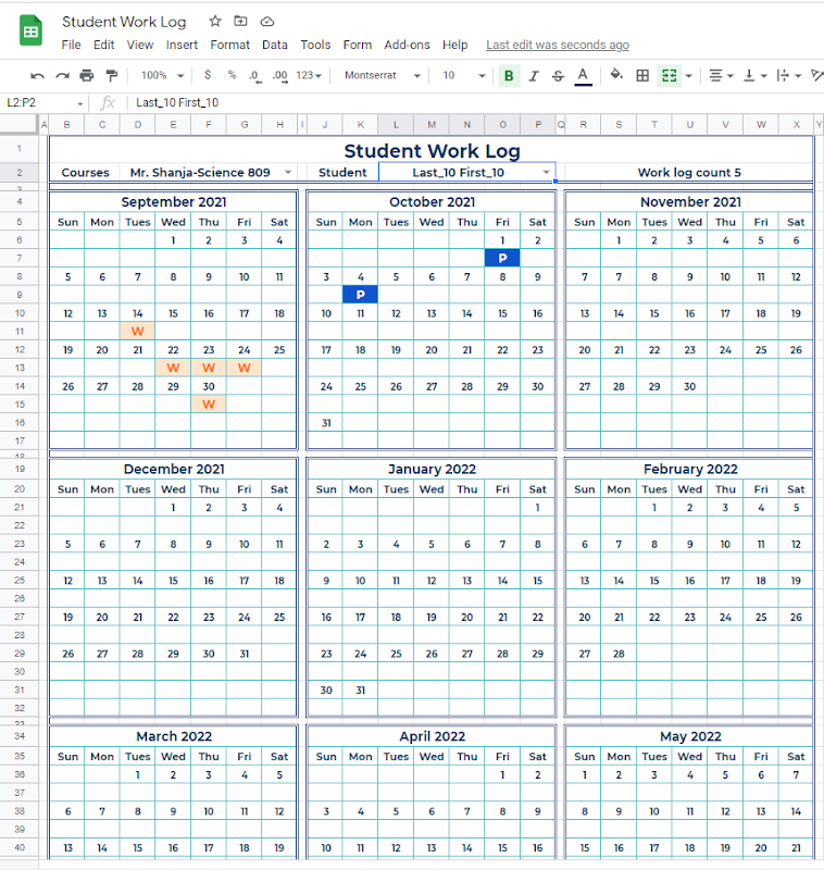 It will also record the number of days a student did work, as well as the last day a student did work. Both are color coded.