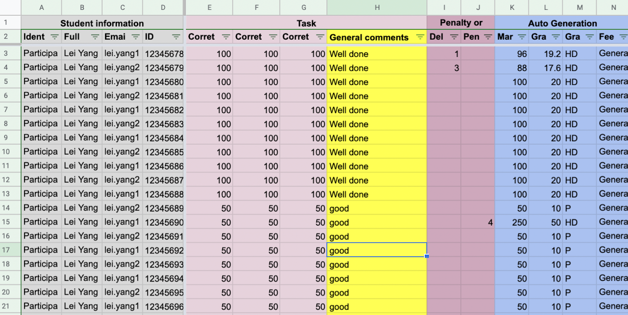 This program significantly reduces the time used to prepare the marking sheet by automatically generating the needed columns which are specified by the users and all the formulas in the spreadsheet. The color schemes and cell styles are carefully designed so that it would speed up the user’s marking process.