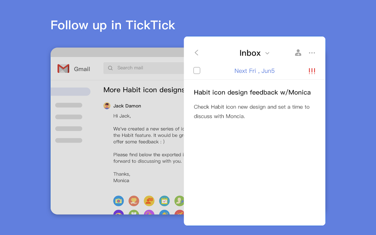 Handle your inbox more efficiently with TickTick for Gmail. Trusted by tens of millions of global users, recommended by The Verge as “great” and Wirecutter (A New York Times Company) as “the best” to-do list app, TickTick helps you stay organized and achieve more with your Gmail. Get more things done with the all-in-one time management solution at TickTick: • Multi-platform: seamless sync across mobile, desktop, tablet, watch, and browsers. • Planner: capture inspirations and quickly add them as to-dos with priorities. • Reminder: get reminded to ease your mind off worrying about deadlines. • Calendar: schedule and keep track of your agenda in five flexible views. • Collaborate: share lists with family, friends and coworkers to stay productive together. • Focus: built-in Pomo Timer and Stopwatch help improve your efficiency. • Habit: develop lasting Habits with the check-in system and goal settings. • Markdown: take beautiful notes with a variety of text formats. • Productivity: Track your productivity trends with informative stats. Stay Organized. Stay Creative! • • • Questions, feedback or tips, please visit https://support.ticktick.com or contact support@ticktick.com Connect with us on Twitter @TickTickTeam; Facebook @TickTickApp; and Reddit r/ticktick.