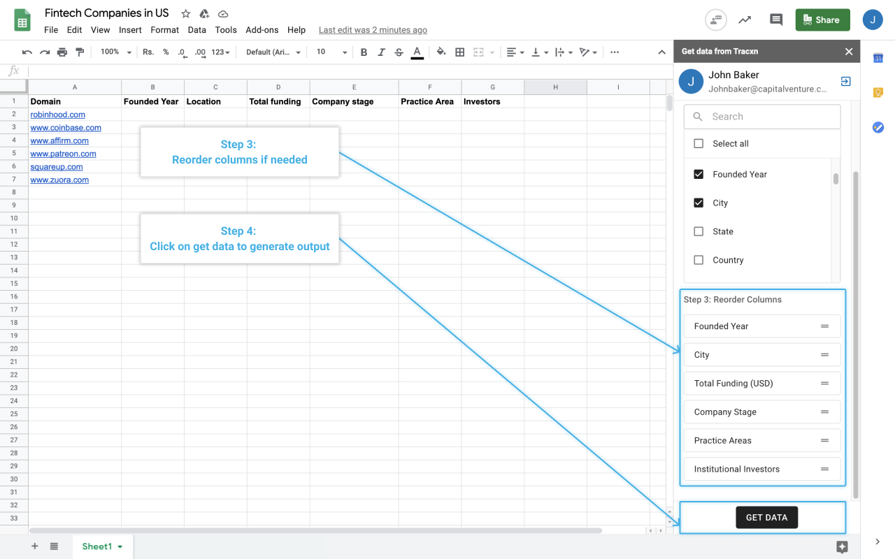 The Tracxn Google sheets plugin makes it easier than ever to create investment diligence spreadsheets. Now, with the Tracxn plugin, you can access our database of 1.4M+ companies directly from Google Sheets. Get the latest data for multiple fields including founded year, location, total funding, investors, and much more. Using the Tracxn Google Sheet plugin: - Install the plugin - In your Google Sheet, navigate to Add-ons > Tracxn > Open - Select companies and output fields - Click on 'Get Data' to update information in your Google Sheet You will need premium access to the Tracxn platform to use this plugin. Reach out to support@tracxn.com for help with the plugin. About Tracxn At Tracxn, we track Innovative companies across 1800+ feeds and multiple countries. Explore the full potential of the Tracxn platform on tracxn.com. Note: No. of customers as on Mar 31, 2021. All other data points as on May 31, 2021
