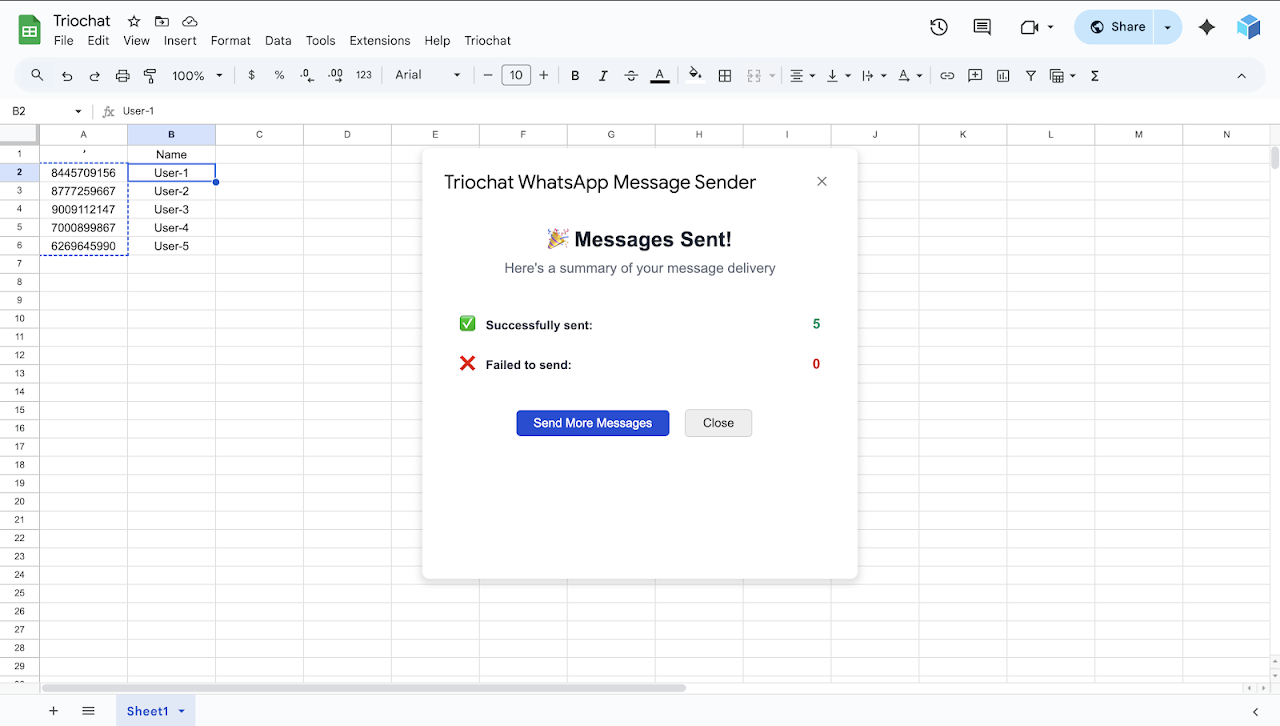 With the Sheet Automation Tool by TrioChat, you can instantly send WhatsApp messages based on data in your Google Sheets™ — no coding or technical setup required.