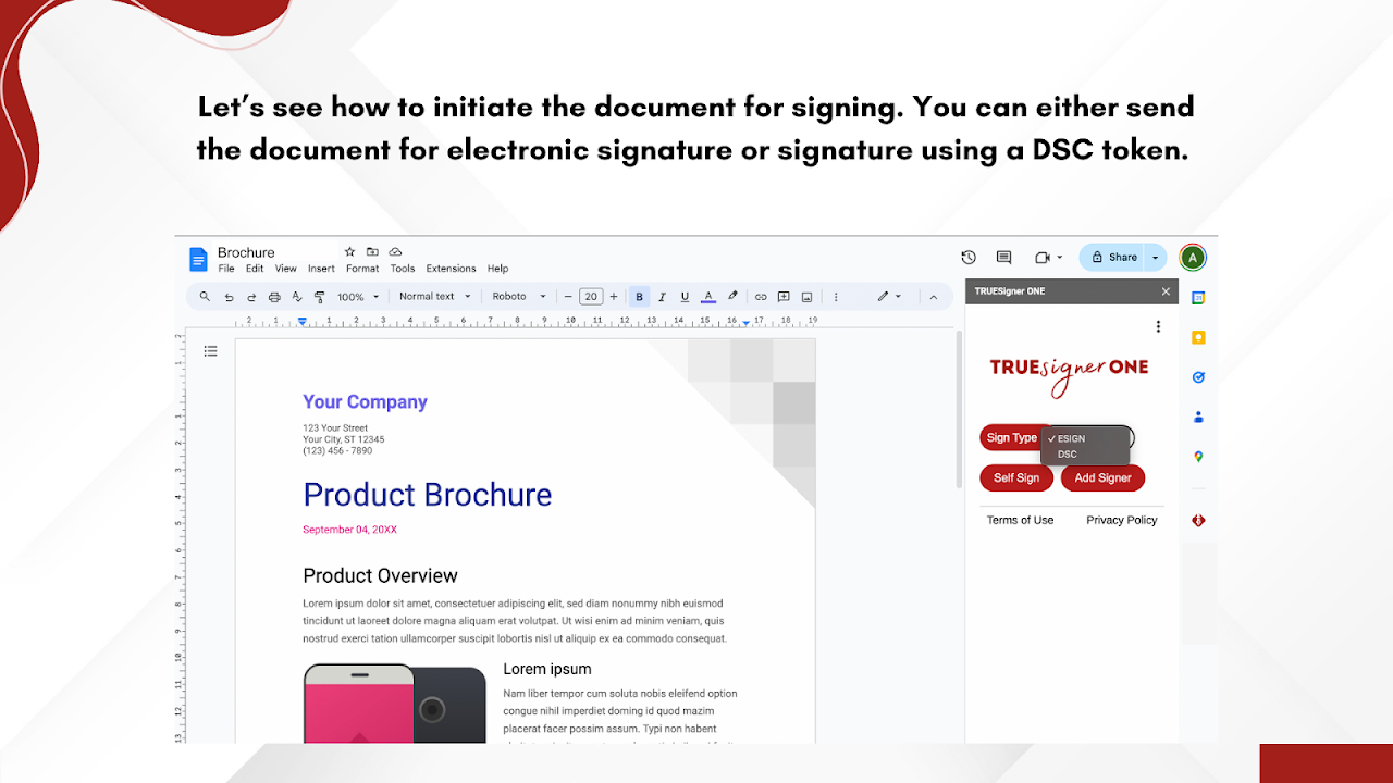 Overview Looking to sign a letter a contract or an agreement? TRUESigner ONE enables you to effortlessly sign, send, and manage documents, directly from Google WorkspaceTM. Signatures done using the app are compliant with eIDAS (European Union), eSIGN (USA) and IT Act 2000/2008 (India). Get your documents signed faster, improve efficiency, and enhance collaboration with this app. Try TRUESignerTM ONE today! Key features: 1. The app supports Electronic signatures and Advanced Electronic signatures (AES) using DSC tokens. 2. Initiate a document by specifying the signer email IDs in the order of signatures. 3. Define the signing location for each signer. 4. Specify up to 5 signers per document. 5. Sequential signatures in the order specified by the user. 6. The status of the document (Pending/Completed) is maintained. 7. A copy of a signed document can be emailed directly from the Google Workspace. 8. A comprehensive audit trail is maintained to ensure regulatory compliance. For further information on the features please visit – https://truecopy.in/truesigner-one/ Get started: 1. Install TRUESigner ONE add on from Google Workspace Marketplace. 2. Select the red and white pen icon on the right sidebar. If the side bar is not visible, look for a small icon in the bottom right corner to expand it. 3. If you do not have an account on TRUESigner ONE, you can seamlessly sign in using your Google account. Your account comes loaded with 20 signatures. You can top up more signatures as required. How to initiate a document for signing: 1. Click on TRUESigner ONE icon. 2. Select sign type – eSign or DSC. 3. Clicking on the ‘Add Signers’ button. User’s email id will be populated as the first signer by default. To remove click on the red cross next to the email address. 4. Click on the ‘Add’ button to add more signers (upto 5). 5. Click on the ‘Send Document’ button, the document is opened for placing the signature locations for all signers. 6. If you are the first signer or selected the self-sign, you can complete the signing right there. Follow given instructions for electronic or DSC token based sign. 7. Other signers receive the signing link on email. The emails are sent sequentially i.e. email to a signer is sent only after the previous signer has completed signing. 8. The signers can click on the link received. They can view the document in TRUESigner ONE and complete the signing. 9. Once all signatures are completed, the document is securely saved to Google Drive and is also available in the your TRUESigner ONE account. About Truecopy Credentials Truecopy Credentials Pvt Ltd is a technology company providing document authentication and digital signature solutions to companies around the world. We are ISO 27001:2013 certified. Our flagship product TRUESigner ONE helps to eliminate paper and save trees. It enables users to sign documents on the go from anywhere. Data Disclosure The only data gathered by TRUESigner ONE is the specifically selected document opened using the TRUESigner ONE Add-on by the user. No other documents within the user’s system are accessed. None of the data gathered is used for marketing purposes or given to any affiliates. TRUESigner ONE adheres to strict data privacy requirements. Questions? Have questions or comments about TRUESigner ONE? We would love to hear from you, so please reach out to sales@truecopy.com