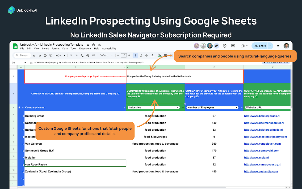Unblockly.AI puts the power of LinkedIn data directly in your Google Sheets™ with these easy-to-use functions: