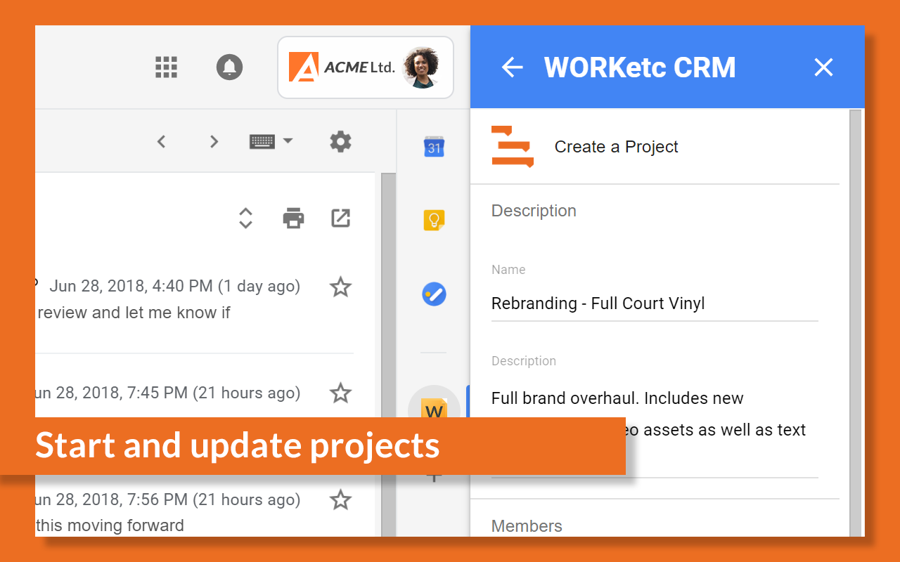 Make Gmail do more with the WORKetc CRM + Projects, Help Desk, & Billing Add-on for Gmail.