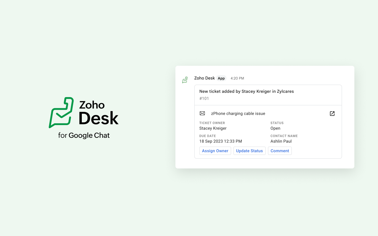 Zoho Desk for Google Chat helps you manage support tickets efficiently and collaborate with your team from one location. It provides you with instant ticket notifications and lets you create, update, and resolve Zoho Desk tickets without leaving the Google Chat window. By installing the app and connecting your Zoho Desk account, you can: - Get real-time notifications about ticket creation and updates. - Create, assign owners to, and add comments to tickets in Zoho Desk from within the Google Chat window. - Use "/" commands in chats to pull information from Zoho Desk and perform a variety of ticket-related actions. - Configure the Zoho Desk bot in your team spaces to keep teams up to speed on key events that happen in your hep desk.