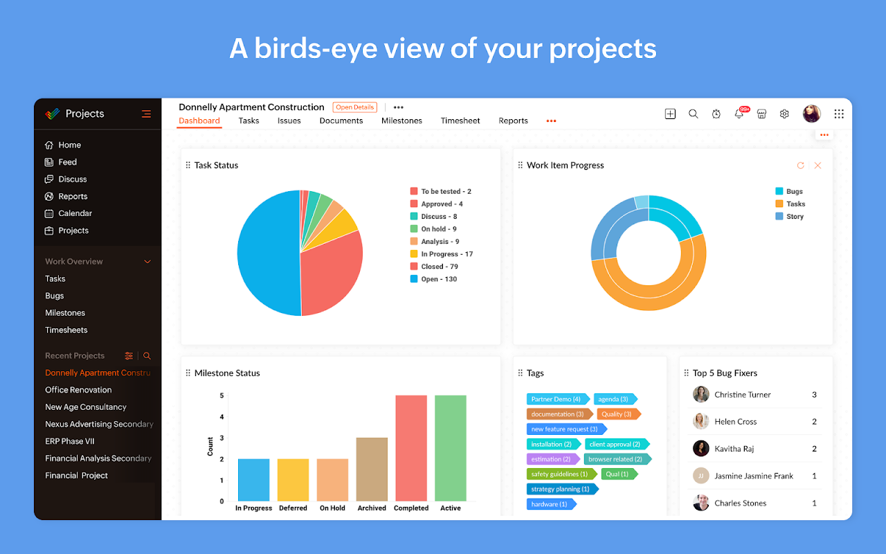 Zoho Projects is a feature-rich online project management tool with collaboration and issues tracking capabilities that allows teams to work together more efficiently.
