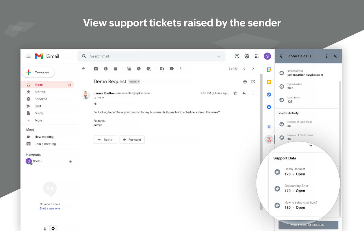 Not having information about your customer can put you in the backseat. Zoho SalesIQ's Gmail add-on pulls all the data you need about the sender and gives you a quick overview to personalize your email. If they're a lead or a contact in your SalesIQ portal, you can see their details without having to leave Gmail. What visitor details can our Gmail add-on bring to you? * Basic details such as name, email, and phone number * Company name and website * Sender's opportunity and lead score * Number of website visits made by the sender * Number of chats made * All of the support data and help tickets raised by the customer * All of the email campaigns sent to that particular customer It brings all of the essential information you could need in a single window, and if you still want more information you can also jump directly into your SalesIQ portal to view the visitor's profile. Learn how to set up the Zoho SalesIQ add-on to your Gmail: https://zurl.co/Kja0 Other Google integrations Zoho SalesIQ offers: Google Analytics: Integrate Zoho SalesIQ with Google Analytics to track the performance of your live chat operations and website. Identify your top-performing website pages, how many chats were initiated in a day, which marketing campaigns are working, and which campaigns need to be optimized. Google Tag Manager: Enable Google Tag Manager and insert the SalesIQ code to track and initiate chats with your website visitors, and push live chat events into Google Analytics without having to edit your website code. Learn more about these integrations: https://zurl.co/KV6Y About Zoho SalesIQ Zoho SalesIQ is an all-in-one customer engagement, live chat, and analytics platform to unify your marketing, sales, and customer support efforts that will give your customers a great experience and boost your business growth. Get to know your prospects better so that you can initiate the right conversation with them at exactly the right time. SalesIQ is optimized to suit the customer communication needs of both B2B and B2C businesses of all sizes. It’s equipped with built-in audio calling, screen sharing, visitor information, lead identification, a drag-and-drop custom bot builder, an AI-driven chatbot with a human touch that automates your customer engagement, and much more. It’s trusted by more than 450,000 businesses, including giants like Mahindra & Mahindra, Renault, IIFL, Suzuki, Zee5, Fluitec, and Borner Corp., to serve their customers at every stage of the customer life cycle. We have a live chat software starting at $0 that scales with your business without burning a hole in your pocket. Mail us at support[at]zohosalesiq[dot]com to get in touch with our support team.